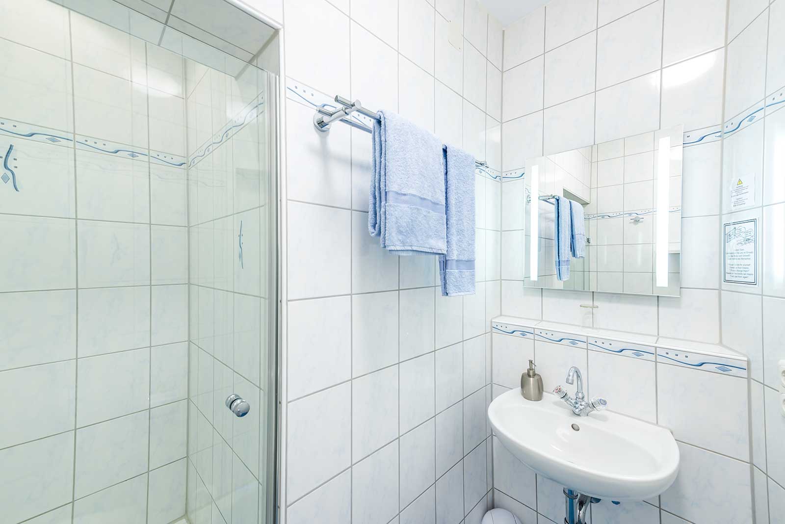 Das moderne Bad verfügt über eine Dusche und ein WC. Zur Ausstattung gehören ein 32” SMART-TV, ein praktischer Schreibtisch, ein geräumiger Schrank und ein Zimmersafe.